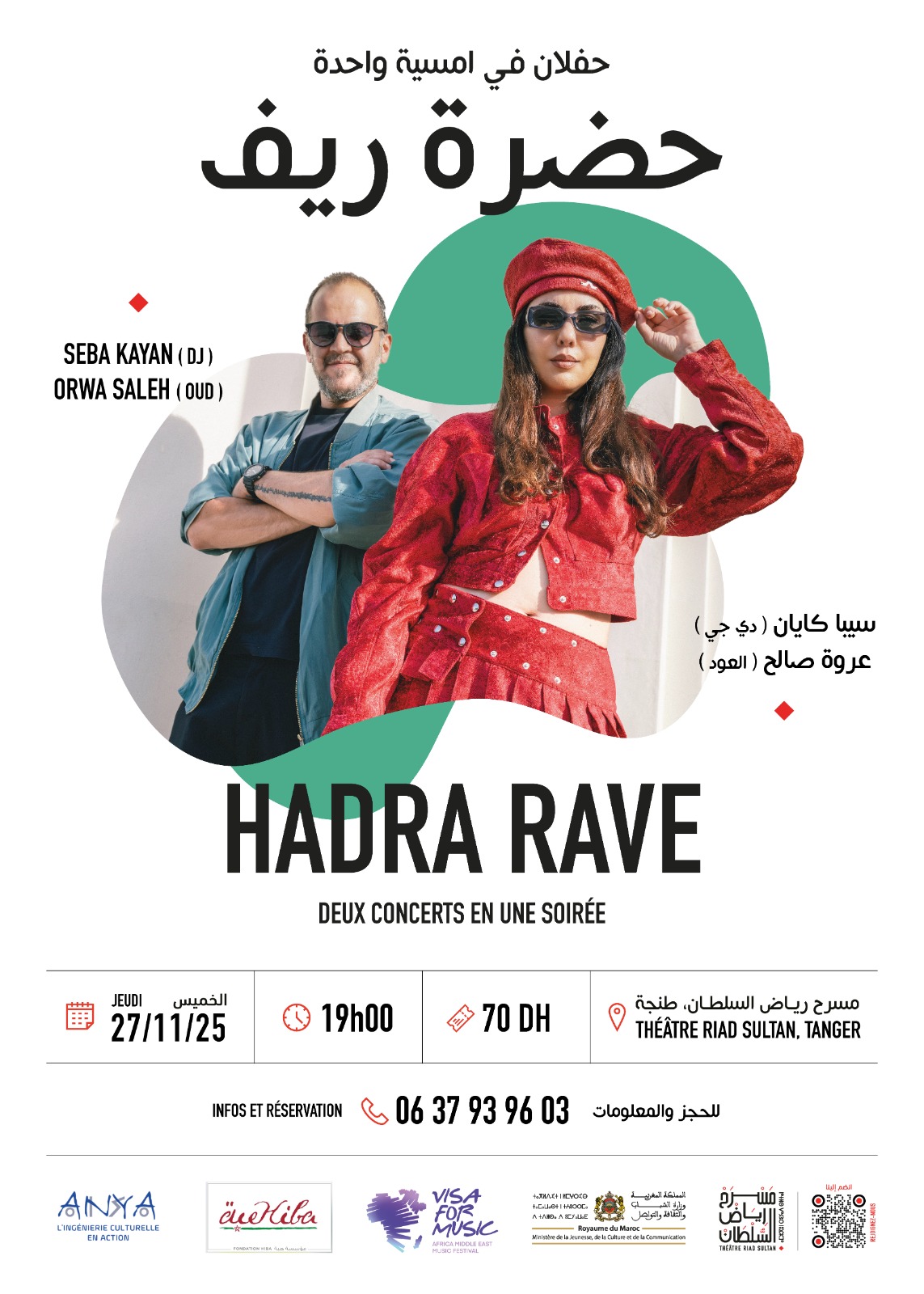 في إطار برنامجه الفني والثقافي المتنوع لشهر نونبر يقدم مسرح رياض السلطان بطنجة، مساء الخميس 27 نونبر، عرضا موسيقيا بعنوان "حضرة ريف"، وهو مشروع فني يجمع بين الموسيقى الإلكترونية والروحانية الصوفية، من إبداع الدي جي النمساوية سيبا كايان والموسيقي السوري عروة صالح. في إطار فعاليات خارج أسوار مهرجان "فيزا فور ميوزيكVisa for Music