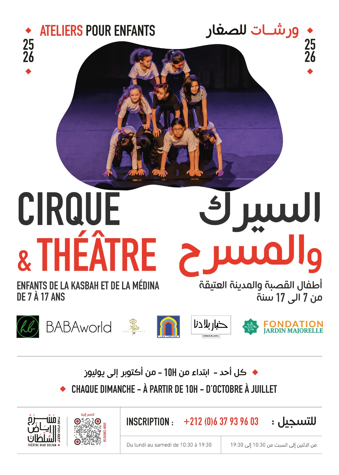 ورشات السيرك والمسرح للصغار، موجهة لأطفال حي القصبة والمدينة العتيقة، الذين تتراوح أعمارهم بين سبع وسبع عشرة سنة، بتأطير غزلان أزار وعزيز علوش. تُقام كل يوم أحد، ابتداءً من الساعة العاشرة صباحًا، وذلك من أكتوبر إلى يوليوز. بشراكة مع مؤسسة حديقة ماجوريل، خبار بلادنا، رياض دار سبأ "Saba's House" وفتيات طنجة"las chicas".