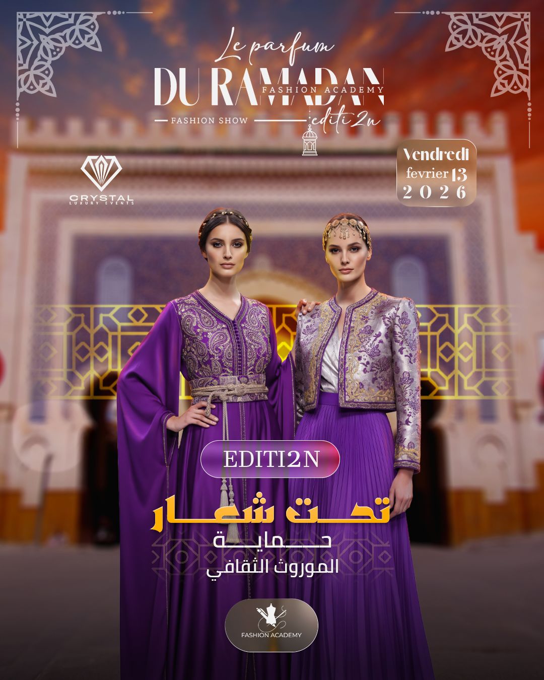 تستعد أكاديمية TLL فاشن بفاس لتنظيم تظاهرة فنية بقاعة كريسطال بفاس يوم الجمعة 13 فبراير ، تشارك فيها طالبات الأكاديمية بتصاميمهن المستوحاة من تيمة الشهر الفضيل ، تحت إشراف أساتذة الأكاديمية وتأطيرهم ، وتعتبر هذه التظاهرة بمثابة تدريب للمصممات في تقديم قطعهن الفنية أمام جمهور كبير ، و هي التظاهرة الثانية التي نظمتها الأكاديمية بعد الأولى التي احتضنها جنان سبيل ، والتي شهدت عرضا فنيا باذخا .